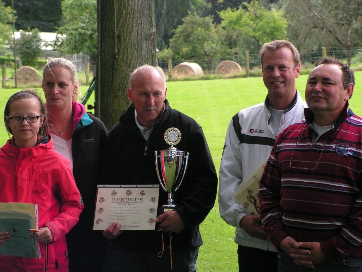 Von Links: Beste Jugendliche und gesamt 7. Platz Jasmin Poullig, zweitplatzierte Nina vom Dorp, erstplatzierter Jürgen Klär, drittplatzierter Uwe Michels mit Leistungsrichter Joachim Wonschik.